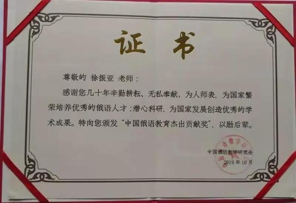 10月24日,第二届中国俄罗斯东欧中亚学会俄语教学研究分会(第九届中国俄语教学研究会)会员代表大会在山东大学举行。大会宣布了第二届“中国俄语教育终身成就奖”和“中国俄语教育杰出贡献奖”的表彰决定,华东师范大学外国语学院俄语系徐振亚教授获“中国俄语教育杰出贡献奖”。这是继朱逸森教授获第一届“中国俄语教育杰出贡献奖”之后,俄语系教授再次获此殊荣。