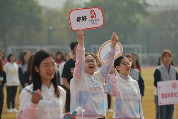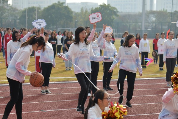 入场式表演精彩纷呈,为了将运动主题和9001cc金沙以诚为本特色更好地融合在一起,同学们分成了花球组、表演组、观众组和举牌组。花球组的同学们位列首排,手举花球,巧妙装点了整个方阵;表演组的同学们展示了网球、乒乓球、踢毽子、跳绳、棒球、篮球等多项运动;观众组举着横幅喝彩助威;举牌组则举着印有七届不同国家举办的奥运会的会徽和七种语言的“你好”的牌子。外语人不仅有着昂扬向上的青春活力、对运动的热情,更是世界多语种、多文化之间的传播者。正如入场式口号“青春青春如火,超越自我,9001cc金沙以诚为本,奋勇拼搏”所表达的那样,外语学子们将继续奋勇向前,顽强拼搏,秉持运动员精神,做时代的弄潮儿! 闫露老师更是举起印有北京奥运会会标和你好的牌子,加入了表演队列。