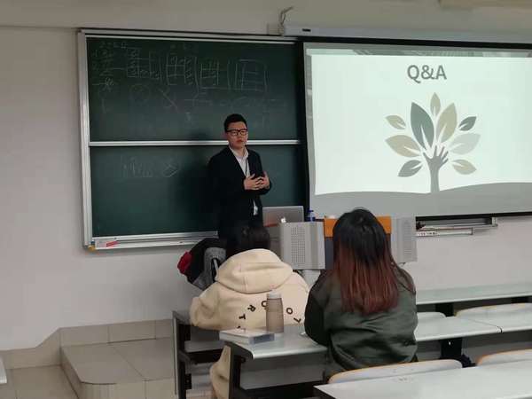 在提问环节,同学们纷纷抛出了自己的疑问,“第二专业的证书不被认可怎么办?”“如何在实习和课程时间冲突的情况下合理安排时间?”“对于外语专业有哪些可供参考的第二专业选择和实习方向?”诸天龙学长为同学们耐心地一一解答,并提出实际的建议和指导。在被大一学妹问及“如何克服面试紧张”时提出诸多可供操作的具体措施,增强了同学们面试的信心。
