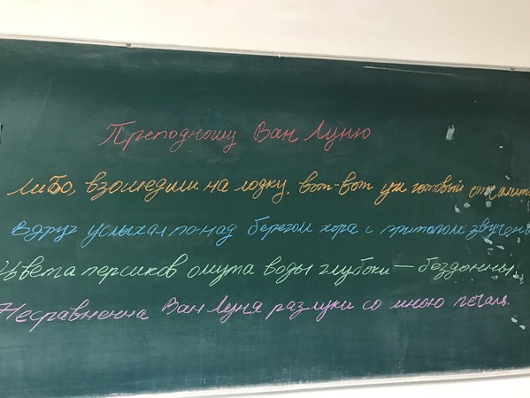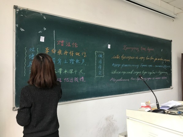 邵鹏洁老师的中俄板书《赠汪伦》宛转隽永,如鸾凤飞舞,且布局合理,构思巧妙。