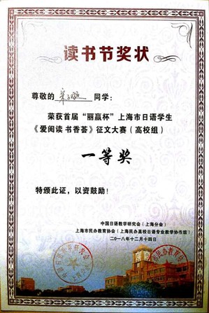 首届“丽赢杯”上海日语学生《爱阅读书香荟》征文大赛活动的颁奖仪式于12月14下午1时许在杉达学院隆重举办。