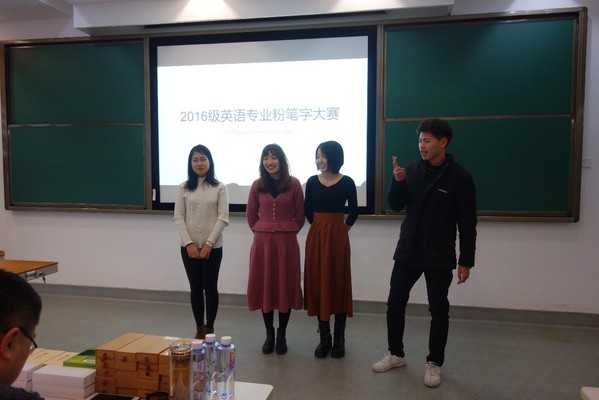 2018年12月28日,正值岁末之际,2016级英语系师范生在一教403进行了一场别开生面的粉笔字大赛,由全建强、冯园园、冯烨和陆云鹏老师等担任评委。