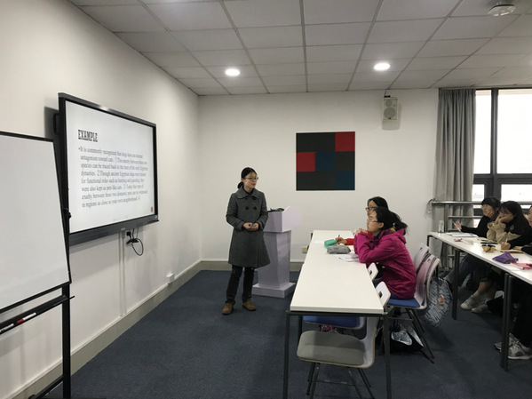 11月27日下午,应9001cc金沙以诚为本大学英语部邀请,复旦大学外文学院写作中心郭骅老师来到大学英语部第二课堂“英语·家”503教室,为我校英文写作坊的同学们带来了一场题为“学术写作的三大要素”的精彩讲座。英文写作坊的负责老师和写作坊全体学员参加了此次讲座。