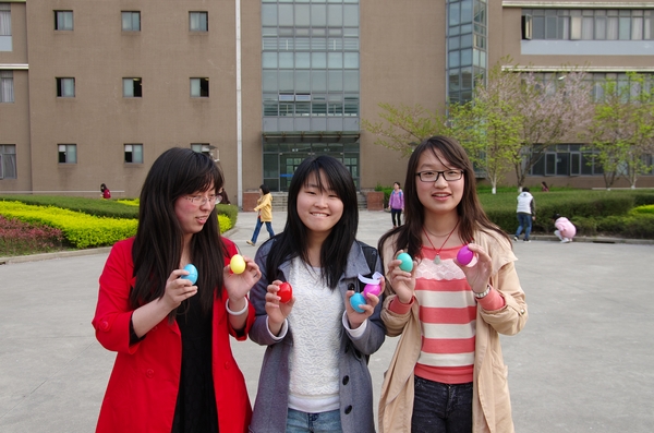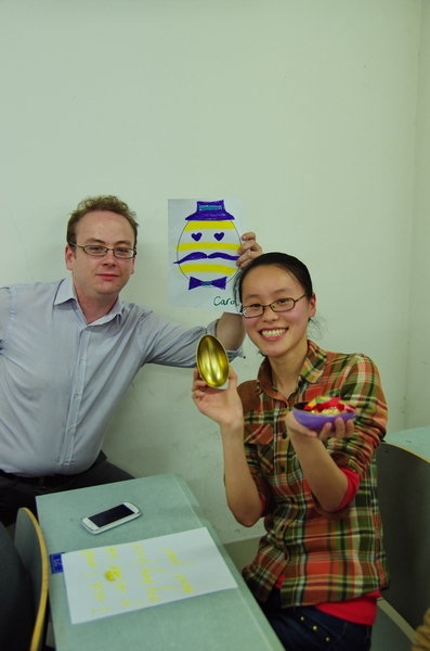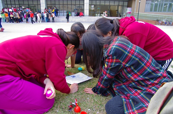 2014年4月3日下午4点,由大学英语教学部组织的英语角与英孚教育再次联手,在二教104教室展开了本学期的第二次特别活动——Easter Egg Hunting。本次活动分为两个部分,画彩蛋与找彩蛋。每位同学都可以在画纸上描绘自己心目中最美丽,最炫彩的彩蛋。不过谁画的彩蛋最能吸引我们外教的目光呢?最终一幅酷似来自英孚外教Paul的彩蛋拔得头筹。接下来,同学该去找彩蛋了。100多个不同颜色的彩蛋隐藏在二教门前的草坪中、花丛里,大树下。临时组队的寻蛋队员们立刻分头行动,很快就有寻蛋队顺利找到了彩蛋。可是,气喘吁吁地找到了蛋,还得凑齐6个不同颜色才能进入下一环节。同学们争先恐后,跑得汗流浃背,但是到了下一环节:“英语小任务”却又必须静下心来破解难题。这对每个同学都是体能和智能的挑战。而所有的场景都是英语设置的,同学们也不由得在整个过程中用英语交流,用英语思考。最终,获得优胜队伍的每个队员在同学们羡慕得眼光中都得到了一个制作精美的复活节彩蛋。