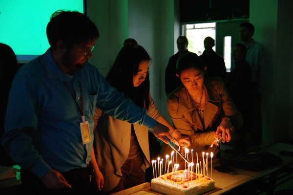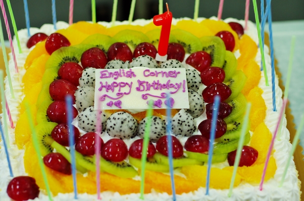 五点整,游戏环节结束后,生日庆祝活动正式开始。首先登场的是多才多艺的学生核心成员陈鹏,他特地为英语角创作了英文主题曲,并在现场倾情演唱。随后,英语角负责人陈启老师主持活动并首先发言。陈老师对每一位关心、支持英语角的老师,同学和朋友们表示了最衷心的感谢。英语角从最初参与者寥寥,到现如今拥有相当数量的稳定参与群体,较高的知晓度,以及多名外教及英孚教育的协助。英语角已经发展成为一个组织形式成熟稳定,活动形式丰富多彩的全英语口语平台。去年年底,英语角更是获得了校教务处教学与改革研究项目的立项支持。英语角的成长与参与组织的每一个老师和学生核心成员的倾情投入是分不开的。今年将有几位学生核心成员卸任,他们也受邀发言,回顾了他们在英语角的点点滴滴,并表达了他们对英语角恋恋不舍的感情。两位即将回国的外教为英语角送上了祝福。最后,在烛光的映衬下,生日之歌回响在教室中。大家捧着蛋糕、分享着英语角这一年的故事。这里,每一个人都是英语角成长的见证者,我们也期待更多同学的参与,期待英语角的下一个周年庆。