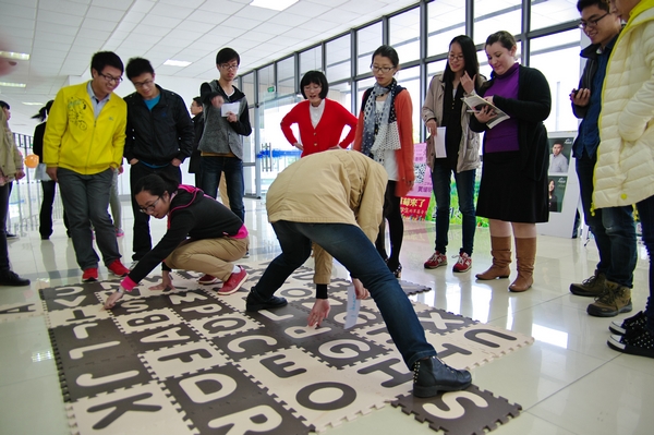 4月24日,我校英语角迎来了她的第一个生日。走进二教104教室,只见门上,墙面,地面到处装点了彩球彩带,黑板上庆祝生日的艺术字在装饰的衬托下格外华丽温馨。咦?门口的字母地图好可爱,有何用途?原来是Twister(扭扭乐),每组参与者必须在地毯上找到指定字母,并用身体的各个部分覆盖,最后再将这些看似无序的字母组成一个单词才算获胜。Photograph、government…一个个单词被或躺、或趴、或“扭曲”着的参与者猜出,围观同学惊呼称赞连连,现场气氛空前热烈。那边,limbo dance 考验了参与者身体的柔软度之后还有英语问题抢答。与此同时,那边的猜词游戏中,同学们也各尽所能。遇到抽象的词汇,想表达清楚可着实要费一番心思。现场人头攒动,同学们在四大游戏阵地中逐一闯关,每一关都由外教打分,最后根据总分赢得不同等级的精美奖品。