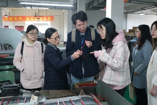 最后,王书记带领实践团来到工厂车间,参观铅笔的生产流程。制作一只小小的铅笔要经过配料、辊压、制板、刨槽等十余道工序才能完成。面对玲琅满目、各式各样的铅笔,王书记介绍道,除了自身旗下品牌的生产外,公司还为一些国外品牌进行代工生产。目前,公司出口产品大部分为贴牌、半成品,而真正以品牌出口的成品受众只是海外华人消费者,仅占出口量的10%左右。由此可见,国际市场对中铅公司“中华牌铅笔”、“长城牌铅笔”这样拥有悠久历史的老字号品牌知之甚少,为此,我们作为外语人助力中国企业走出去责无旁贷。