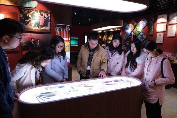 王书记首先带领实践团参观了公司的博物馆,讲述了中铅公司八十余年由筚路蓝缕到繁荣腾飞的发展历程。通过王书记介绍、以及观看公司八十周年大庆时制作的纪录片,同学们了解到,中国第一铅笔有限公司是一家专业生产经营以笔类文具为主导的企业,是老凤祥股份有限公司旗下的一级子公司。中铅公司铅笔生产历史可以追溯到上世纪三十年代,堪称我国铅笔工业发祥地。经过八十多年滚动发展,目前已经形成了上海、江苏、东北三大生产基地,实现了“两头在沪,中间在外”的产业新格局,成为国内最大、最完整的全产业链铅笔制造企业。