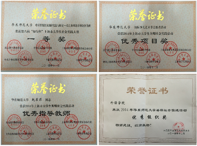 第六届“知行杯”上海市暑期社会实践大赛一等奖,2014年华东师范大学暑期社会实践“最佳项目奖”
