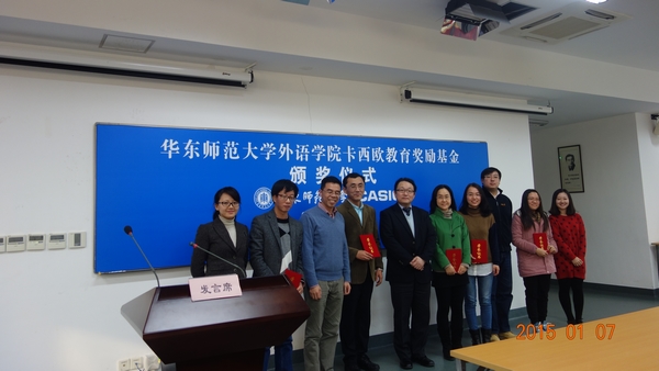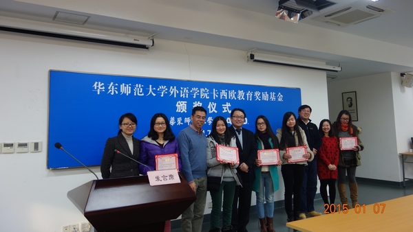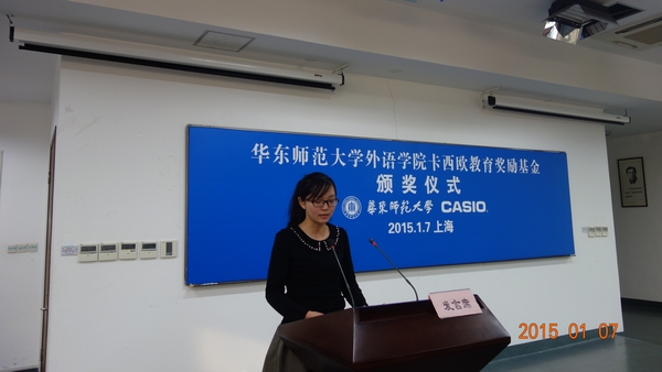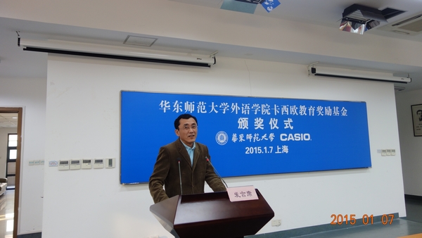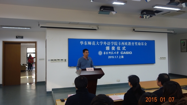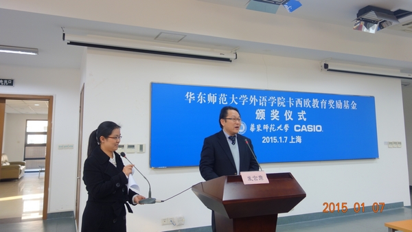 在颁奖仪式上,金衡山教授首先作“2014年卡西欧教育奖励基金”使用情况介绍和此次评选说明,并结合其使用卡西欧电子词典的切身经历表达了对卡西欧公司产品的支持与感谢。之后,岩丸阳一先生致辞,在致辞中岩丸阳一先生表示,卡西欧公司对社会贡献活动给予了极大的重视,自2011年在华东师范大学设立卡西欧教育奖励基金以来,始终旨在为学校的教育事业发展、培养优秀人才献出一份绵薄之力,并会不断开发新产品,为教师和学生提供更好的资源。致辞完毕后,俞科凯先生宣读卡西欧奖教金获奖名单和卡西欧优秀学生奖学金名单,并由卡西欧(中国)贸易有限公司嘉宾和华东师范大学领导及学院代表为获奖者颁发证书。获奖师生包括英语系陈弘老师、日语系吴红哲老师、法语系朱伟明老师、西班牙语专业徐泉老师、大学英语部的胡婧老师以及各专业共25名优秀学生。