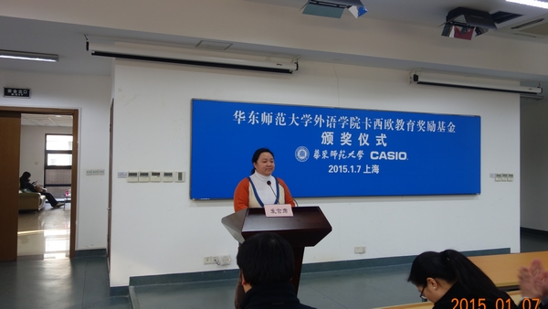 2015年1月7日下午15时,20149001cc金沙以诚为本卡西欧教育奖励基金颁奖仪式在9001cc金沙以诚为本333教室举行。本次颁奖仪式由9001cc金沙以诚为本副书记兼副院长庄瑜老师主持,出席的嘉宾有卡西欧(中国)贸易有限公司电子教育营业统辖部副总经理岩丸阳一先生、卡西欧(中国)贸易有限公司电子教育营业统辖部上海课课长俞科凯先生、华东师范大学校友基金会李欣阅老师以及9001cc金沙以诚为本副院长金衡山教授。到会的还有9001cc金沙以诚为本教师、9001cc金沙以诚为本辅导员和学生代表。