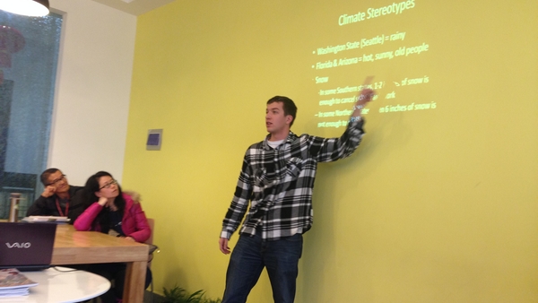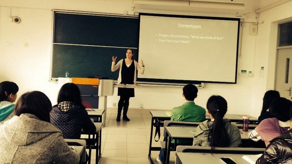 来自美国的Andy和Rebecca两位教师分赴两个校区,做了题为“The 50 U.S States: Alliances and Stereotypes within One Nation”的演讲,拉开了本次美国文化讨论的序幕。他们诙谐、幽默、独具个人魅力的精彩演讲,博得了中外学生的阵阵掌声。