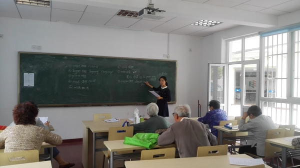 首先,志愿者范舒楠给老年人讲解歌词。她将每句话中的复杂词汇挑出,细致地讲解词义,并适当扩展,帮助老人们举一反三,更多地了解单词的意思和用法。老人们听得很仔细,并且认真做了笔记,此外,他们还积极思考,不时提出一些疑问。老人们与志愿者相互沟通,还教授了志愿者们一些未曾学习到的音标知识。