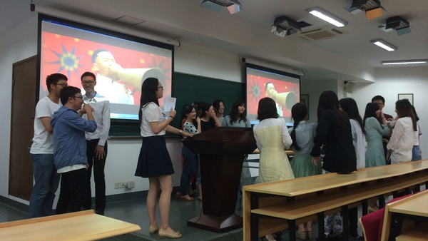 随后大一同学邀请所有大四同学参与游戏,请他们写出自己的三个特点而后让所有的同学来猜这些特点的主人,大四同学积极参与,游戏环节十分热闹。之后还进行了《爱的抱抱》的游戏,使晚会气氛越发高涨,大四同学也借此与我们分享了许多学习生活上的建议。
