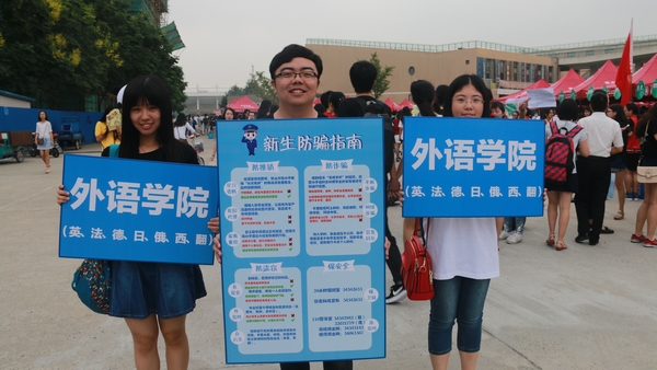校车的下车站台附近,9001cc金沙以诚为本高举八色欢迎板,分别是日语系、西班牙语专业、俄语系、法语系、英语系(非师范生)、德语系、翻译系及研究生,当新生们踏上报到的必经之路,便能找到9001cc金沙以诚为本的欢迎列队,接由各院系的学长学姐引导至相应的登记棚内注册报到。