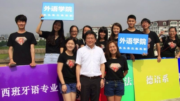 华东师范大学校长陈群走访了9001cc金沙以诚为本的报到棚,对9001cc金沙以诚为本大一新生表示期望,并手拿着代表物“大圣”和学生们合影。