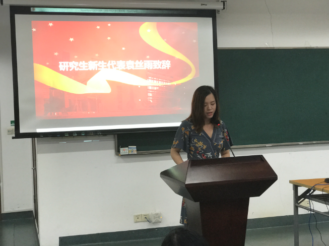 最后,新生代表袁丝雨发言。对于“新”与“旧”她表达了自己的独特体会。新的学习阶段提出了新的挑战。研究生阶段以专业性的学术研究为主,学习内容的深度和难度将远大于本科阶段。不过她希望大家不忘“初心”,在修行中提升自己,武装自己,不忘怀旧事旧友带给自己的触动,不忘记欣赏世间美好的初心。