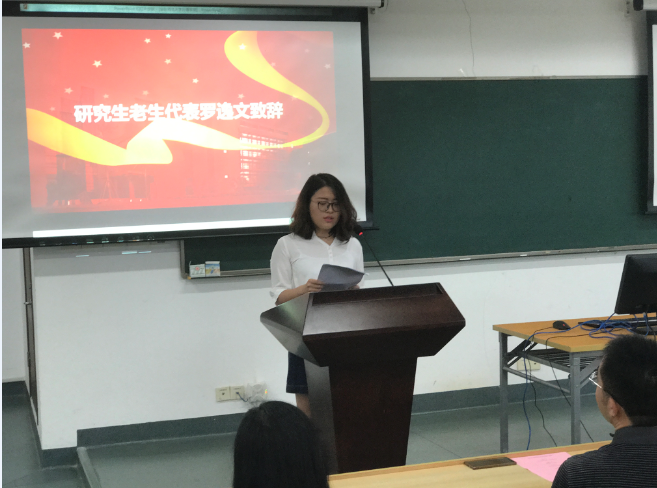 接下来研究生老生代表罗逸文发言。对于即将开展的研究生生活,她提出三点建议:一是树立学习目标,明确奋斗方向;二是充分利用学校的教育资源;三是用心感受淳朴的师生情和同学情。希望新生们能在新环境中,学会跳脱出外界的喧嚣变动,学会与自己相处。