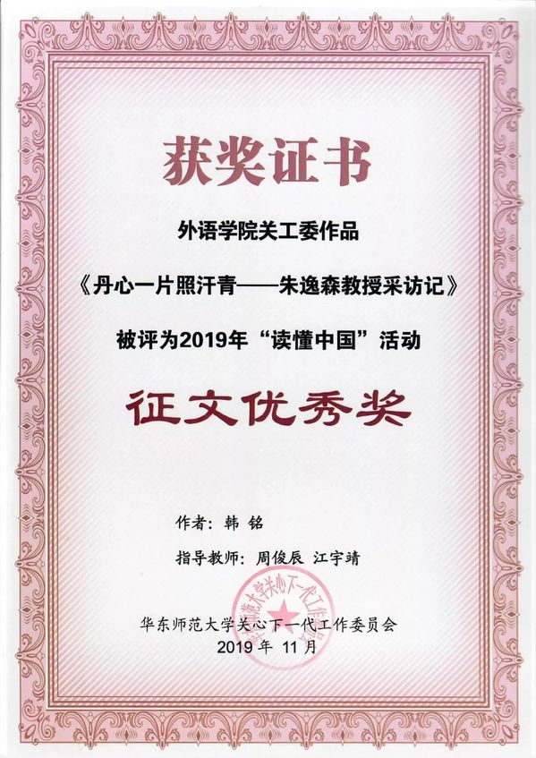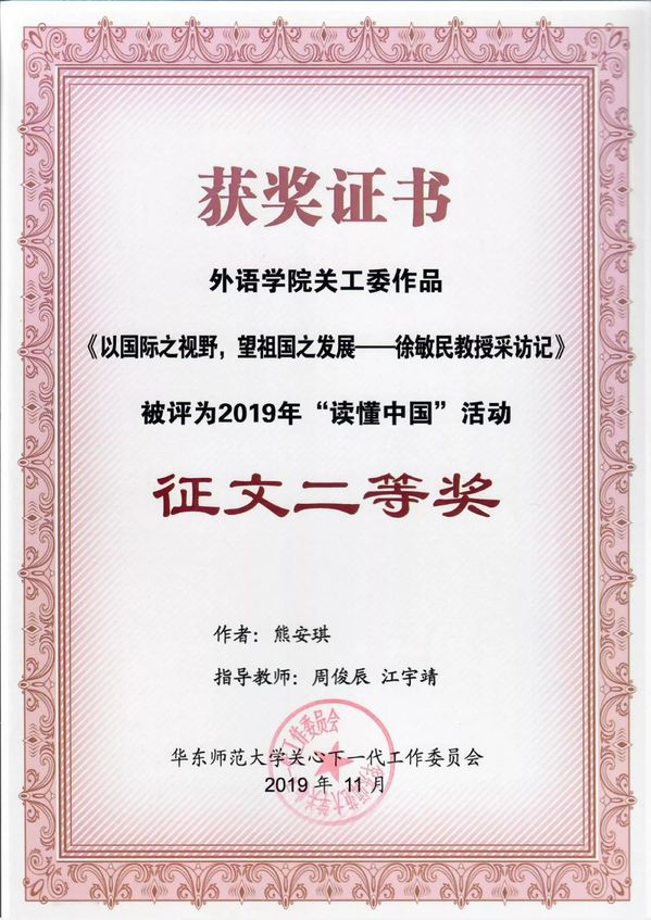 2019年,读懂中国活动以“我和我的祖国”为主题在全国高校全面开展,近千所高校、百余万名大学生参与。9001cc金沙以诚为本指导并推荐的日语系2018级本科生熊安琪的作品《以国际之视野,望祖国之发展——华东师范大学徐敏民教授采访记》荣获校关工委2019年“读懂中国”活动征文二等奖,英语系2017级本科生韩铭的作品《丹心一片照汗青——华东师范大学朱逸森教授采访记》被评为校关工委2019年“读懂中国”活动征文优秀奖。