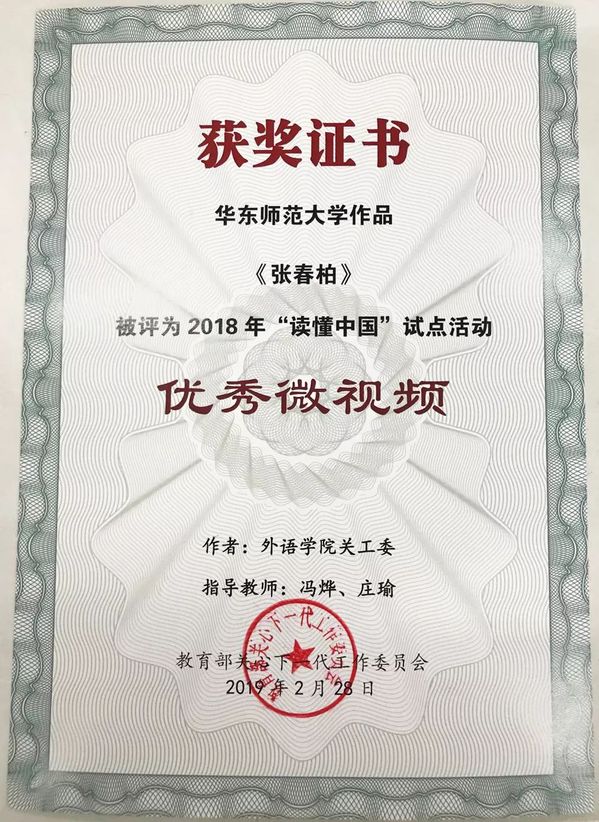 2018年,9001cc金沙以诚为本积极响应“读懂中国”活动,组织学生走访、访谈院关工委教师张春柏教授与何慧敏教授,在9001cc金沙以诚为本前党委副书记庄瑜(现任心理与认知科学学院党委副书记)、团委书记叶青、宣传员冯烨的指导下,拍摄制作微视频获校关工委一等奖,并被推选至教育部关工委参加评比,最终荣获教育部关工委2018年“读懂中国”活动优秀微视频奖。