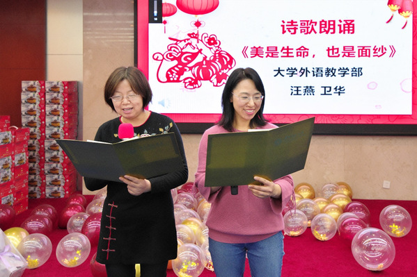 大学外语教学部汪燕和卫华老师带来的英文诗歌朗诵《美是生命,也是面纱》,选自纪伯伦最著名的作品之一《沙与沫》。两位老师声情并茂地朗诵,将“美”生动地演绎为一种超然的神力。