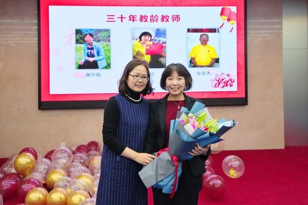 工会主席苏俊玲老师为30年教龄教师代表尹松老师献花,感谢她们将最美的青春奉献给教育事业,以高尚的师德影响了一批又一批青年学子。