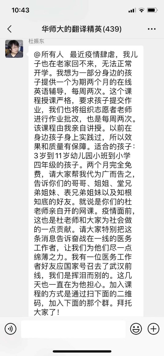几天工作下来,志愿者们感触颇深。作为志愿者团队成员之一的2019级翻译硕士生谭怿同学说:“这个冬天,对所有中国人来说都不好过。在此情况下,杜振东老师的爱心志愿教学活动显的尤为珍贵,当辅导员在群里发布这个消息的时候,我第一时间报名了。目前我在团队里主要担任客服这一职责,帮助杜老师处理家长孩子们日常学习的问题,加入这个团队后,我发现这个团队特别温暖,每个人都尽职尽责,非常专业,尽管是志愿活动,每一个人都是任劳任怨的,绝不怠慢,也能和老师们学到很多知识,受益匪浅,作为翻译系的一名学生,能运用专业知识为几百名家长孩子服务,让他们能够学到知识,让我感到很荣幸!”华东师大校友、2011级翻译硕士向婷谈到:“当杜老师把举办爱心英语班的消息告诉我们的时候,我感觉到了一种“使命召唤”——可以作为外语人为战胜疫情做点什么了!因此我毫不犹豫地加入了这个团队!杜老师的爱心辅导班是有温度的,华东师大这个大家庭是温暖的,我为是这个家庭的一员感到自豪!”