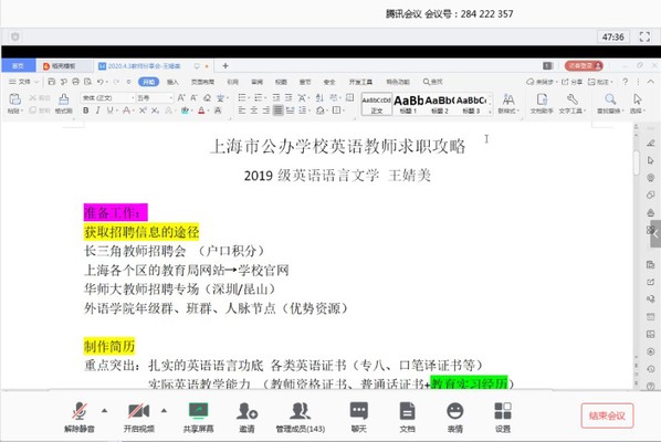 讲座以后,参加活动的同学在线上会议室提出了不少疑问,比如“如何平衡研究生学习和实习时间”,“上海编制考试的人数录取情况”,“小语种老师工作课时”“ 研究生成绩在求职过程中是否重要”等等。学姐们将各自的经验倾囊相授,耐心解答,让每位参与的同学受益匪浅,更加明确教师行业的动态和需求。
