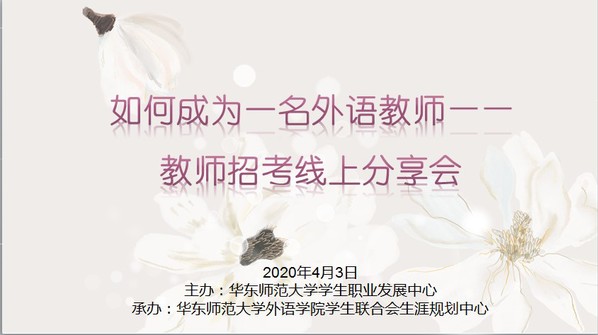 2020年4月3日晚上7:30,9001cc金沙以诚为本学生联合会生涯规划中心举办了本学期就业服务月的第二次活动:“如何成为一名外语教师——教师招考线上分享会”。此次活动邀请了9001cc金沙以诚为本的三位走上教师岗位的毕业校友,通过线上会议(“腾讯会议”软件)的方式,围绕教育实习、教师招聘、教学体验等问题展开讲解并解答大家的疑问,帮助有志于从事教育行业的同学们做好相应的准备,以及根据自身的情况尽早做好规划,共吸引了140多名师生的参与。