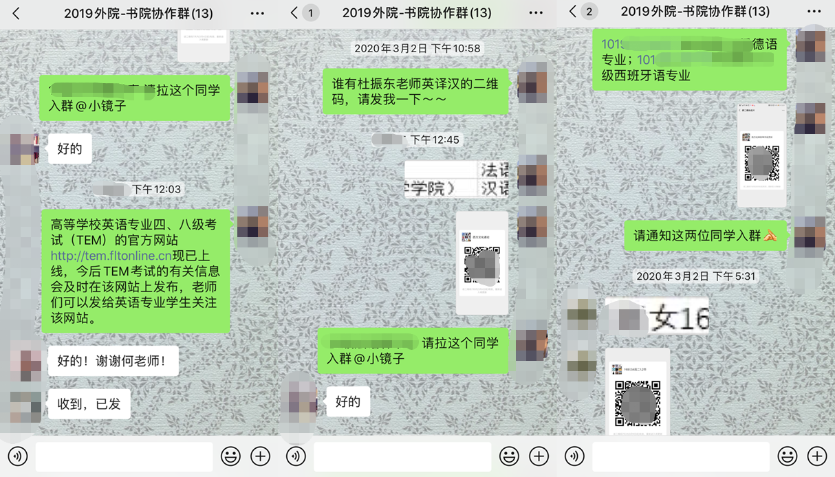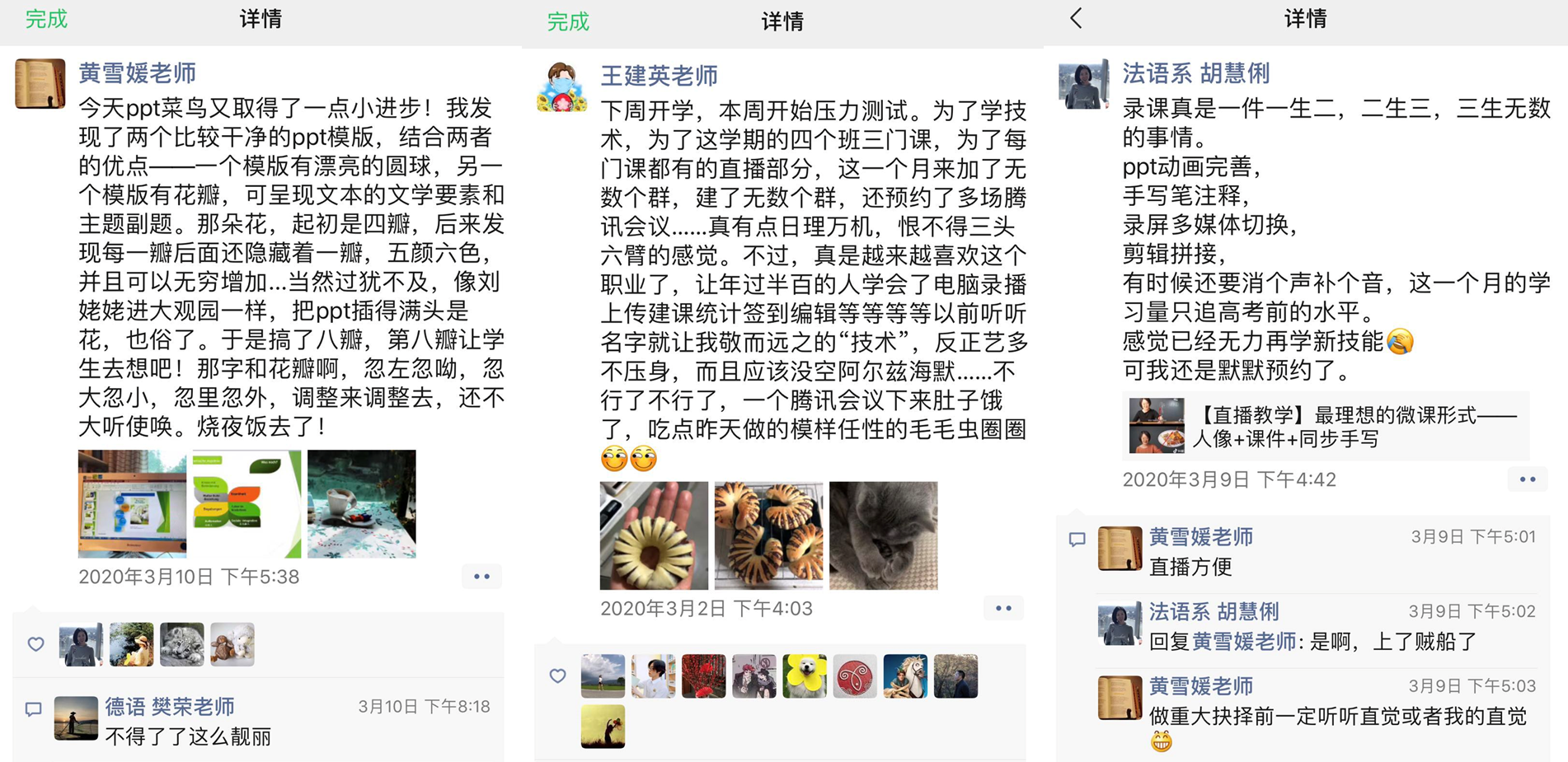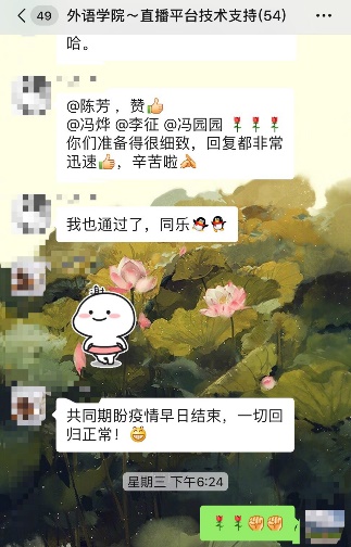 德语系黄雪媛老师提到,同系的樊荣老师给予她很多帮助,不厌其烦地帮助她解决许多操作问题,现在,她可以独立完成一堂网络直播课,还可以对PPT进行美化升级。日语系王建英老师表示,自己越来越喜欢教师这个职业,让“年过半百的人学会电脑录播、上传建课系统、统计、签到、编辑等等以前听名字就令人敬而远之的技术”,真正体会到了技多不压身!法语系胡慧俐老师提到,即使“录课技术学习量直追高考水平,无力再学新技能”,但“还是默默预约了新的微课教程”,继续探索线上教学的奥秘。西班牙语教研室针对“全面在线教学”这一新事物开展线上会议,老师们纷纷围绕着具体课程发表了自己的看法,准备分工合作,集体备课,以饱满的精神来迎接新挑战。老师们振奋精神,全力以赴,坚定决心要呈现一堂精彩的在线课。正如英语系张浩敏老师所说:“同学们要做的就是保持身心健康,学习的事就让各位‘UP主’带着大家一起完成,让我们直播间里再见!”