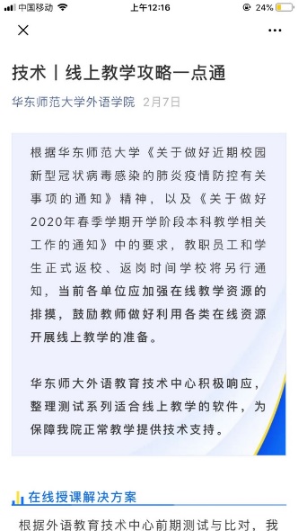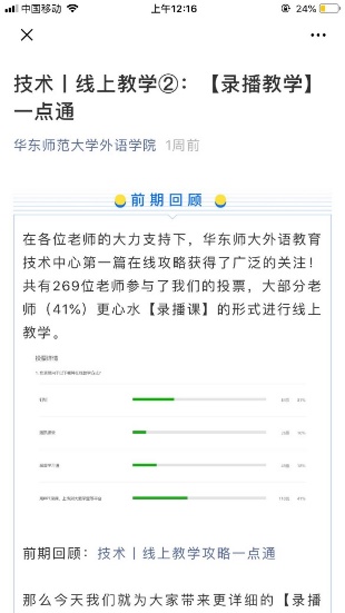 学院充分发挥外语教育技术中心的力量,成立“云技术服务组”为教师提供远程定向指导,全天候为老师们在线教学工作排忧解难。“云技术服务组”对市面上现有的线上教学软件进行了详细调研,经过反复测试、研究与比对,从十余种产品中遴选出了适合外语线上教学的产品,分成直播课和录播课两类进行推荐。为了让授课教师更详细地了解在线教学的操作逻辑和软件的使用方法,技术组的三位老师精心制作了各款软件的操作视频和文字教程,通过9001cc金沙以诚为本微信公众号整合发布。截至2月20日,微信文章累计阅读量超过7000人次,详实的解析和简易的操作流程得到了老师们的认可,除9001cc金沙以诚为本教师外,其他院系和高校的教师都从中受益。