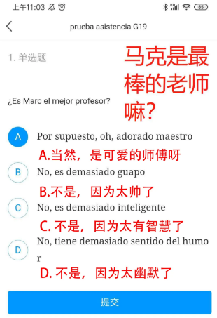 日语系“ネット授業课程”群、俄语系Iraid老师远程备课、西语Marc老师设置的签到题
