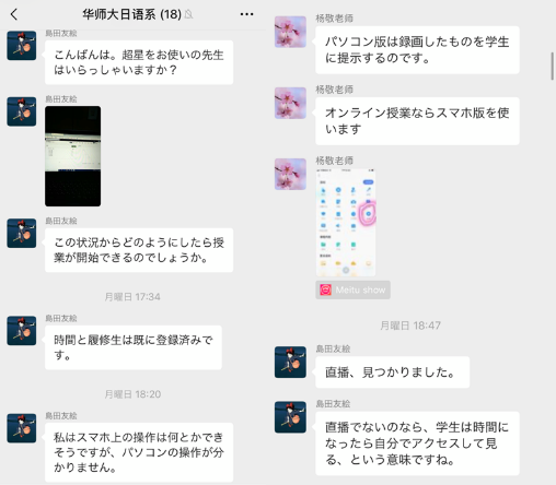 面对外籍教师语言不通、软件使用困难等问题,各专业师生协同一心,想方设法提供贴心远程服务。同时,外教老师们尽职尽责,认真完成备课要求。日语系专门组成了“ネット授業”技术群,由经过培训的助教们提供一对一的日语技术支持;专业老师们也积极开展互帮互助,及时分享使用心得,与外教们一起共渡技术难关,为正式开课前做好各项准备;外教森老师和岛田老师也认真探索中国教学软件,根据课程特性不断调整授课方案,顺利完成压力测试。俄语系Iraid老师为了做好因课施策、以学生为中心,在比较钉钉、腾讯、超星的功能后,选择了钉钉直播;在选择建课平台时,有老师提醒她超星平台相对简单,为了比较,她还是进入大夏平台,浏览后她兴奋不已,连连称赞大夏平台模块非常丰富并马上在上面建起了课。西班牙语专业Marc老师克服一切困难,认真准备教学材料,制作PPT及录制视频,如今已经可以熟练使用超星学习通与学生进行互动。
