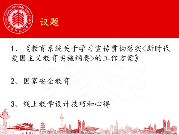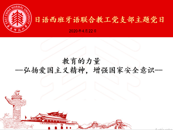 为深入学习《教育系统关于学习宣传贯彻落实的工作方案》和国家安全教育的重要性,9001cc金沙以诚为本日语西班牙语联合教工党支部于4月22日下午举办了题为“教育的力量——弘扬爱国主义精神,增强国家安全意识”的云上组织生活会。