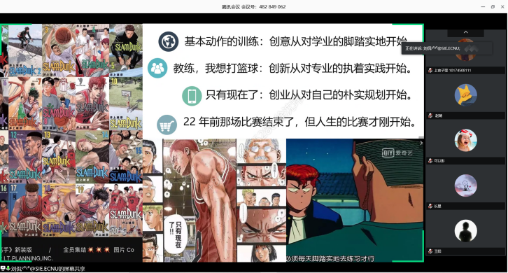 第三部分,刘老师介绍了创新创业人才应具备的素养。刘老师和我们分享了他最爱的动漫《灌篮高手》,主角们永不放弃的精神吸引了很多观众的喜爱,这其中也包含对创新创业的启示。首先,就像打好篮球要练习基础动作一样,创意的诞生一定是建立在对自己专业的深刻了解之上,建立在充足的知识和技能积累之上。其次,就像《樱木花道》中三井寿大声喊出“教练,我想打篮球”一样,创新创业也需要一颗执着实践的心。最后,因为创业之路漫长且不简单,刘老师提醒同学们应该提早做好规划。