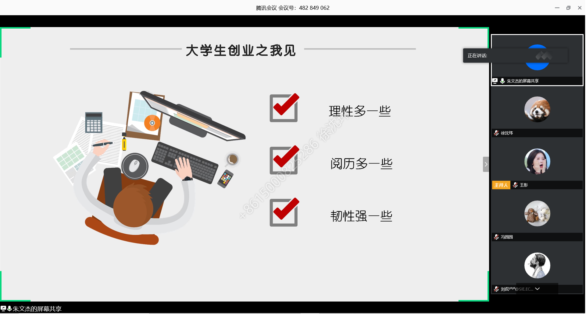 然后,朱老师分享了对创业者的建议。在朱老师看来,创业者需要具备的三个素质是理性、阅历和韧性。创业需要热情,但不能只有热情。创业有风险,这就要求创业者必须理性地对市场进行分析,思考自身是否具备相关的专业技能。此外,在有了阅历的积累后再进行创业,就可以避免一些知识、经验方面的欠缺。最重要的是要有韧性,而不能因为遇到挫折就放弃。朱老师说,许多创业成功的人士也可能是第二、第三次创业了,屡败屡战的精神是每个创业者所需要的。