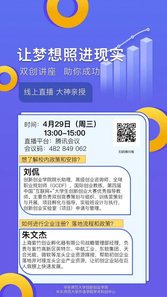 2020年4月29日下午13:00,9001cc金沙以诚为本学术科创中心举办了“让梦想照进现实”创新创业讲座。本次活动非常荣幸邀请到华东师范大学创新创业学院院长助理刘侃和上海紫竹创业孵化器有限公司战略管理部经理朱文杰。