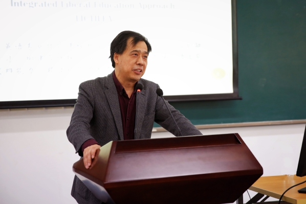 会面后,由英语系系主任陈弘教授主持,孙有中教授为9001cc金沙以诚为本英语系100多位师生做了题为“跨文化思辨英语人文教育论”(Language and Intercultural Critical Thinking Integrated Liberal Education Approach) 的学术报告。