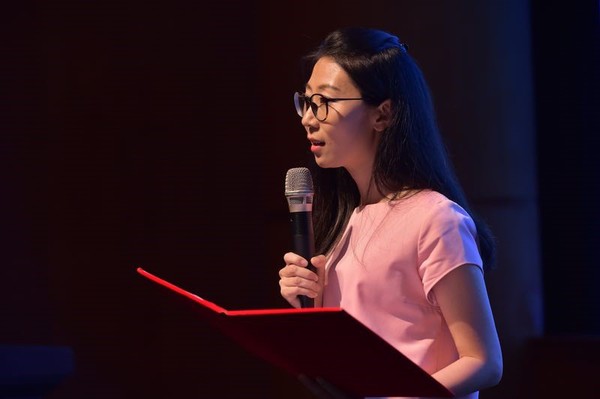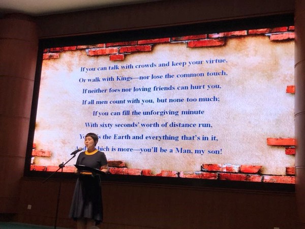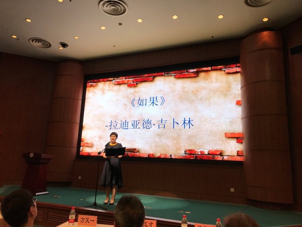 郭雯婷老师第四个出场,她用中英文朗诵了十九世纪末英国诗人拉迪亚德·吉卜林写给儿子的励志诗《如果》。声音温雅柔和,语调自然流畅,感情充沛又传情朴实,以一种返璞归真的娓娓道来,一种充满生活气息的美,赢得了评委和听众热烈的掌声。