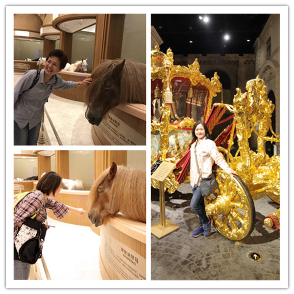 下了马车,随后的重头戏是参观马文化博物馆,一楼名马馆里,几十匹来自世界各地的品种马环绕着巨大的展厅里一圈排开,伊犁马、顿河马、阿拉伯花马、弗里斯兰马……还有传说中的汗血宝马,听名字就知道这些马儿出身不凡。有的高大健壮,有的小巧玲珑,有的皮毛油光水滑,还有的鬃毛编成娇俏的小辫,惹得大家纷纷与心仪的马儿合影留念,胆大的还忍不住伸手与马儿互动。移步地下的藏品馆,还可欣赏与马有关的各种古朴别致的中式瓷器和豪华闪亮的西式古典马车。