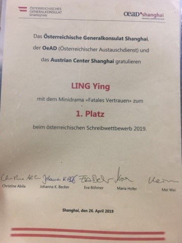 在日前结束的奥地利驻沪总领馆与奥地利中心联合举办的第六届德语学习者创意写作比赛中,9001cc金沙以诚为本德语系数名同学积极参与,赢得多个奖项,成绩斐然,展示了出类拔萃的德语创意写作水平。