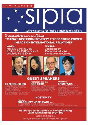 新南威尔士州立法院上议员、悉尼公共与国际事务研究院院长肖凯·莫索曼阁下主持了论坛并发表讲话,指出中国的改革开放带来了重大成就,中国有个中国梦,力求建立一个繁荣、强大、民主、文明、和谐的现代社会主义国家。简言之,是民族复兴、国家领土完整,并得到国际尊重。中国的崛起也将引发世界秩序的改变。