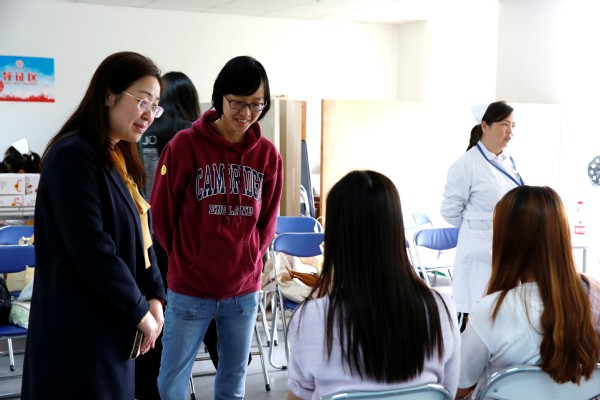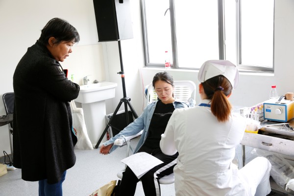 早上八点钟,学院党委副书记江宇靖、辅导员和参加献血的同学就已经陆续赶到校医院,在志愿者的引导和组织下排队有序填写表格,接受体检并进行采血。活动中,院党委书记闫露来到现场对献血同学进行了慰问。“我终于献血成功了!”德语系大四学生毛添萌开心地说到,去年她因身体原因遗憾没能参与献血,毕业前夕她终于完成自己的心愿,没有留下遗憾。队伍中有多次参与献血的学生,有的更是每年都来。还有的学生是初次献血,不免有些紧张,但是更多的是激动与自豪。辅导员们陪伴在学生身边,一颗颗爱心巧克力寄托了老师对学生的关爱。现场气氛温馨。