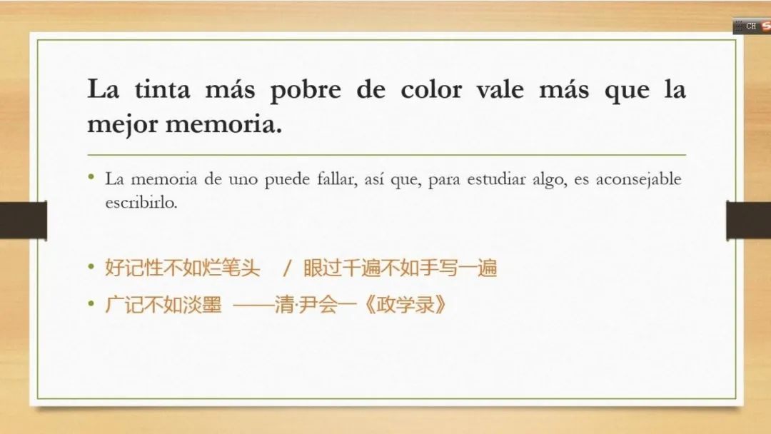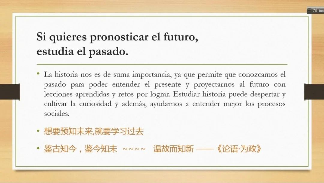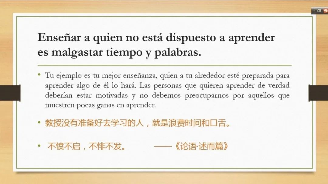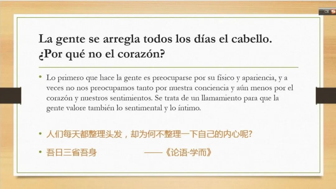 徐泉老师首先介绍了《拉丁美洲历史和文化概论》一课录播结合直播的线上教学经验,相关的教学设计案例已于4月28日以“‘线上教学’融合‘课程思政’→1 + 1 > 2”为题经9001cc金沙以诚为本公众微信号推送,同时也在我校教务处5月10日所发布的“9001cc金沙以诚为本多语种在线教学,用全球视野感知世界声音”的系列推送里。在此次研讨会上,徐老师重点分享了公开课的相关案例:通过带领同学学习西班牙语谚语,提升学生综合语言运用能力;通过翻译富含劳动人民智慧的西班牙语习语,宣扬普世美德,引导学生树立正确的人生观、价值观;将习题中的西班牙语谚语与中国习语进行类比和凝练,激发学生将不同文化、思想内涵融会贯通的能力;在援引世界经典文学形象堂吉诃德的同时,结合《论语》、《孟子》、《道德经》等传统文化的经典思想,传承中华文化的精髓。