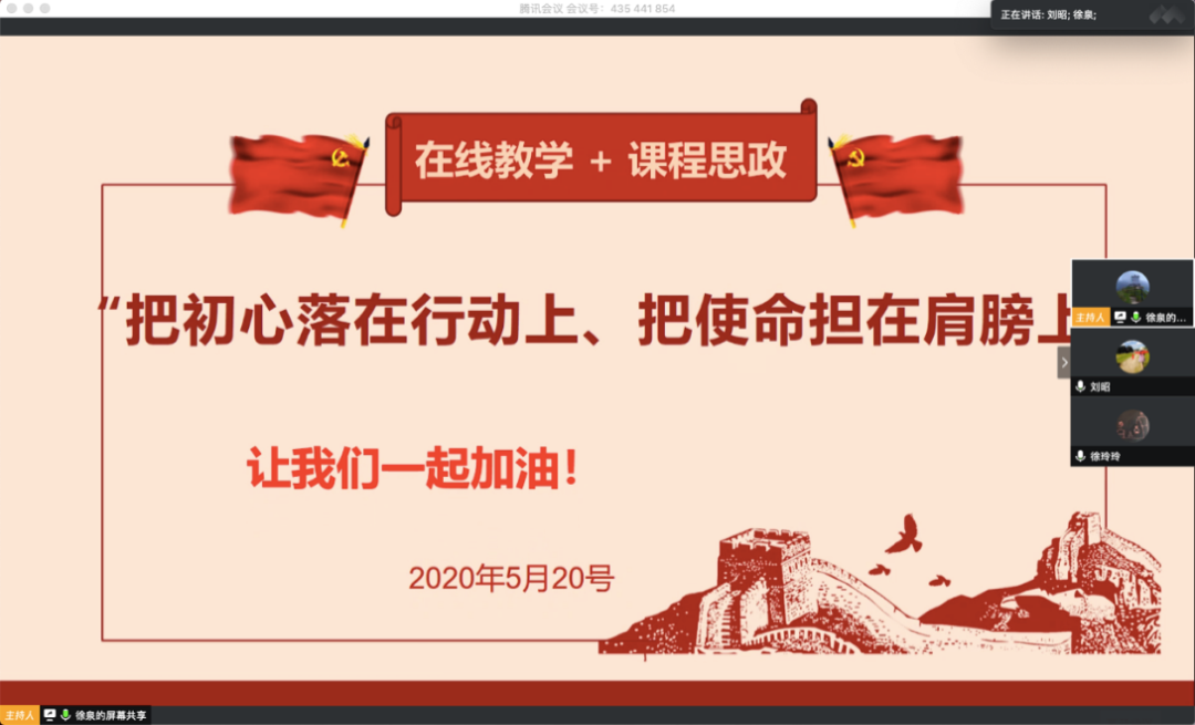 最后,徐泉老师总结,在线教学中不仅要注重知识的传授和能力的养成,更需注重培养学生正确的世界观、价值观、人生观,提升其民族自豪感和文化自信心,并有意识地训练其获得批判性思维的能力。此次的线上课程思政研讨会总结了近期工作,明确了下一阶段的教学工作重点,三位老师均表示将继续融合课程思政开展在线教学,努力追求知识传授、价值塑造和能力培养的多元统一,做到“把初心落在行动上、把使命但在肩膀上”。