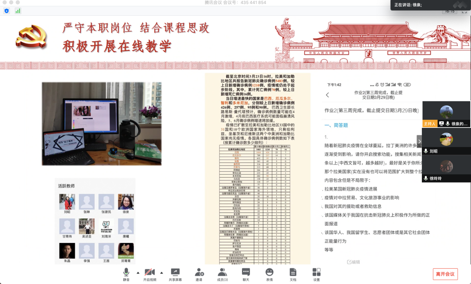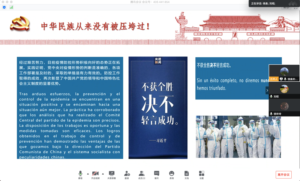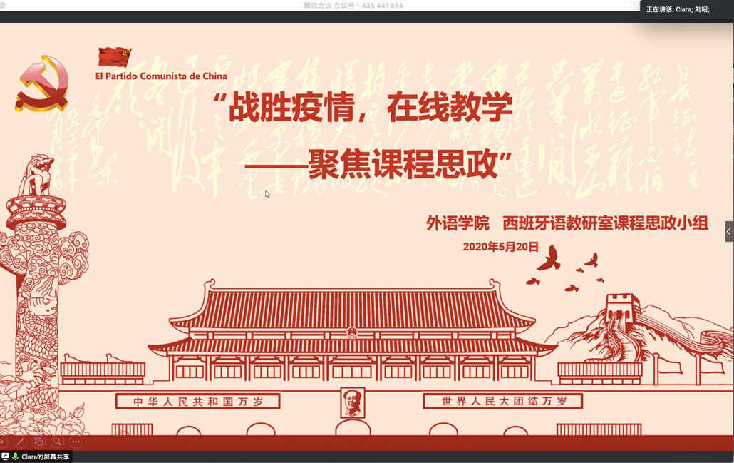 5月20日,西班牙语专业课程思政特色教学改革项目的主持人徐泉老师与项目组成员徐玲玲老师和刘昭老师一起,通过腾讯会议平台开展了名为“战胜疫情,在线教学——聚焦课程思政”的云研修活动。