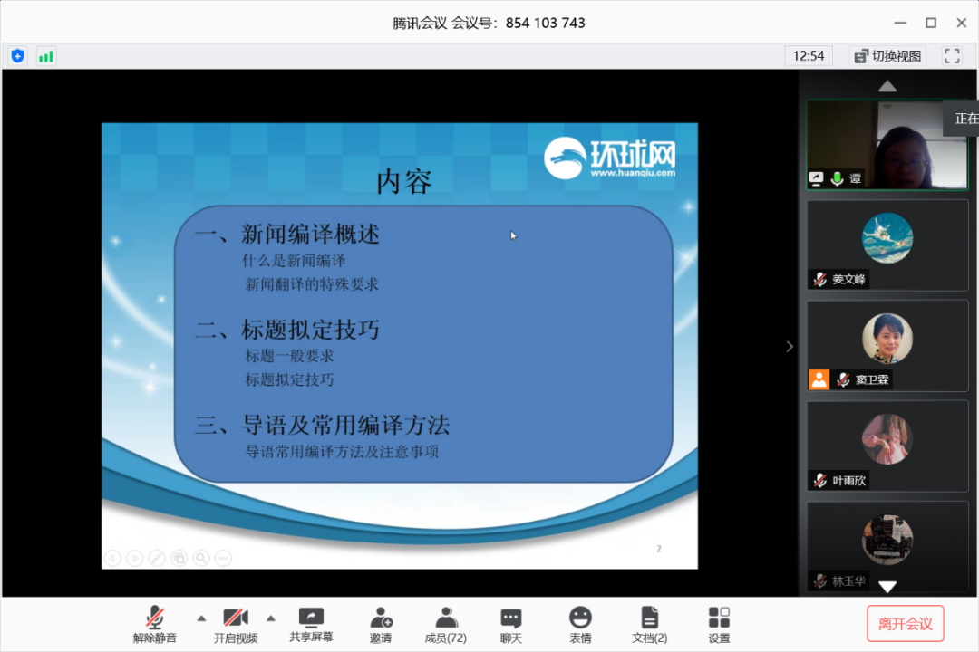 2020年5月27日下午3点在腾讯会议平台,翻译系窦卫霖教授主持了第一讲“编译概述及标题和导语编译技巧”讲座,主讲人是环球网海外传播中心编译组副主编谭利娅女士,她是西安外国语大学高级翻译学院MTI硕士研究生实践导师,环球网编译部高级记者。具备十年以上新闻从业经验,多次参与网站重大新闻选题的策划和报道,并曾先后赴日本、菲律宾、马来西亚等地进行实地采访报道。现主要负责环球网海外传播中心大编译平台学生实习项目院系资源维护,并参与环球网多语种舆情项目报告撰写工作。