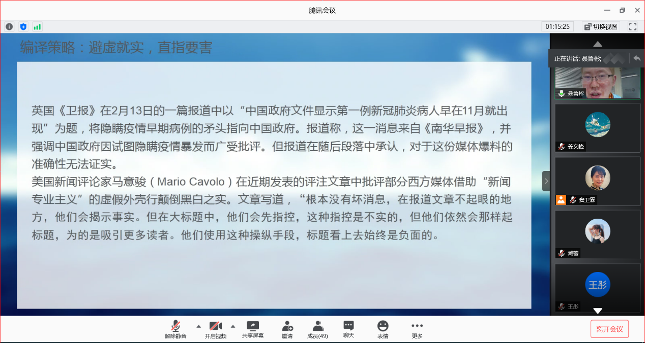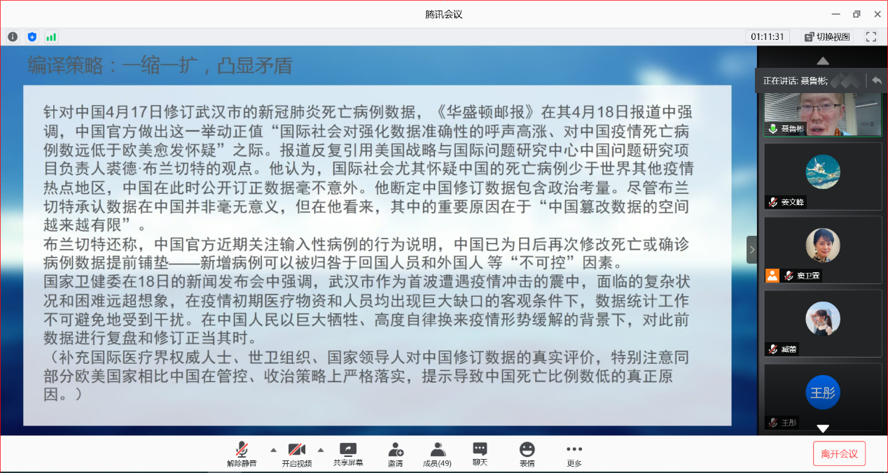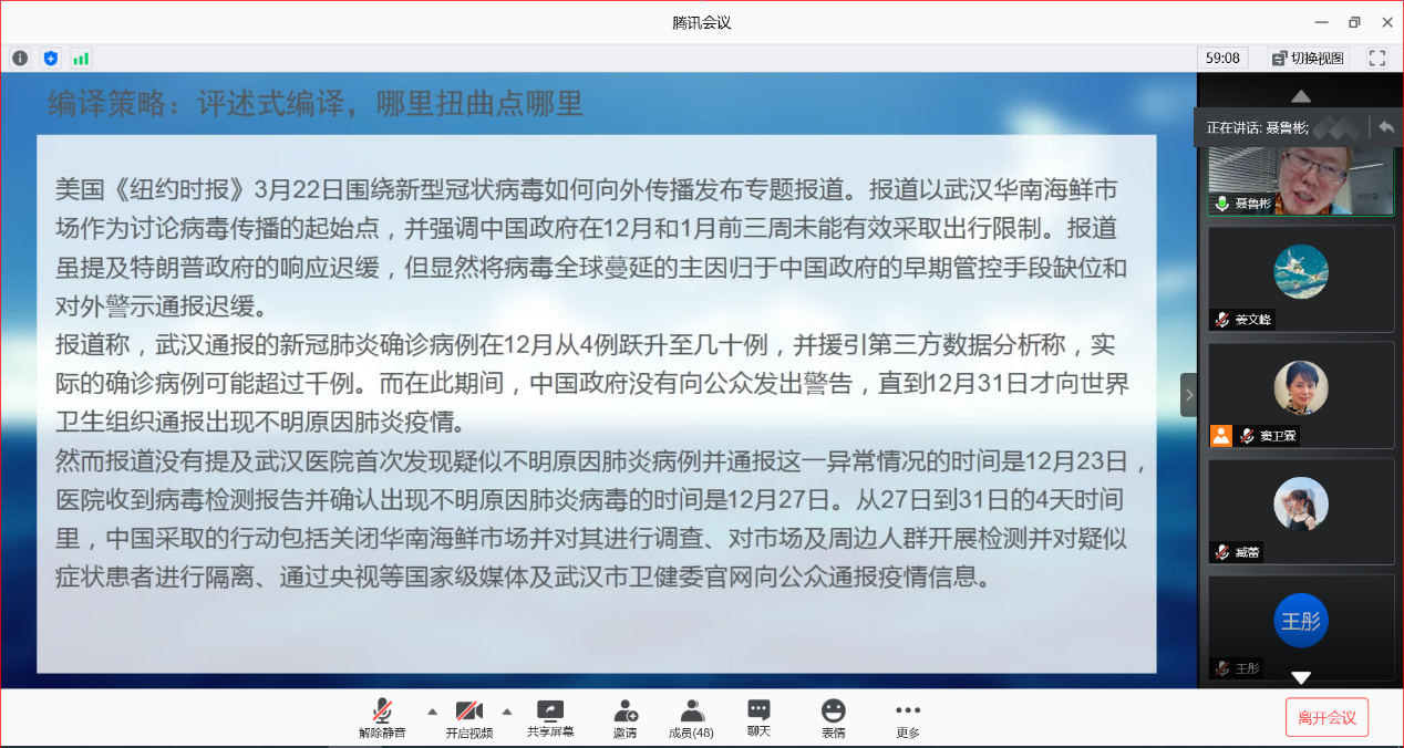 2020年6月10日下午3点,由翻译系主任陈弘教授主持的“新闻编译实践与技巧”系列线上讲座第三讲——“新闻编译中的思维导向因素辨析及案例讲解”在腾讯会议举行,本次受邀的主讲人为环球网海外传播中心舆情组主编聂鲁彬先生。