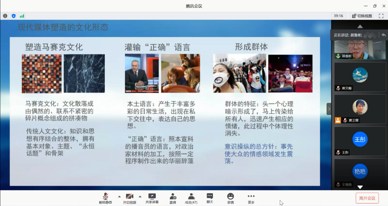 接着,聂主编向大家介绍了意识形态开展操纵活动的途径。当绝大多数民众既不愿意把心力和脑力,也不愿意把时间花费在一味的怀疑所得到的信息上时,意识操纵便能够展开。