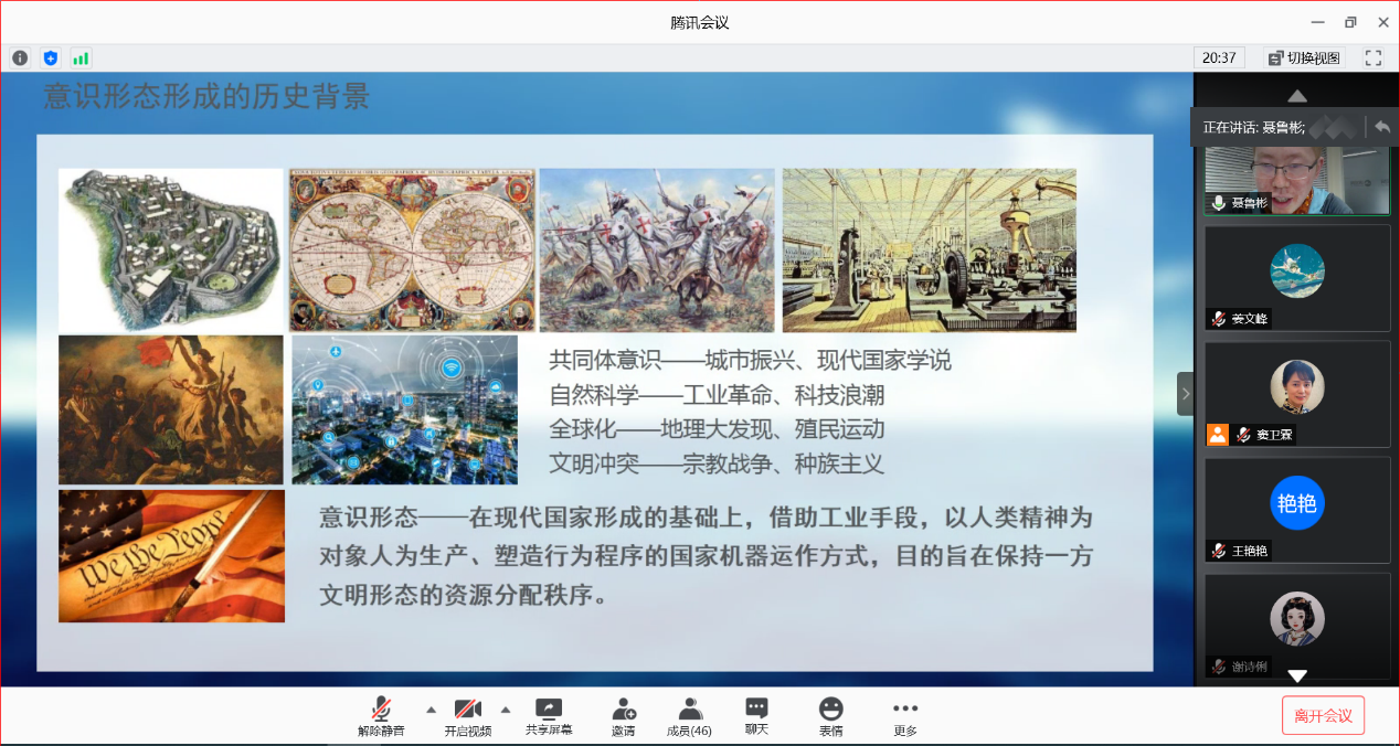 随后,聂主编从共同体意识、自然科学等角度入手,梳理了意识形态形成的历史背景,并总结了意识形态的概念。指出:意识形态会塑造文化形态。西方意识形态对社会进行的改造首先体现在对文化的改造,将传统的宗教、人文文化解构,逐渐形成形式上丰富而实质上相互疏离的马赛克文化;其次通过文化生产链灌输所谓“正确”语言,该类语言往往产生于照本宣科的播音员的语言,将人文的、自然的语言改造为表面富于现代性、实质上囿于思维定势的标签化语言,并通过文化传播机构为此类语言赋以社会正统地位,从而形成适于思维导向的语言环境。另外,西方意识形态善于对严肃、深邃个体理性实施催眠,激发基于欲望和情感的群体形成,为民粹赋予理性外衣。
